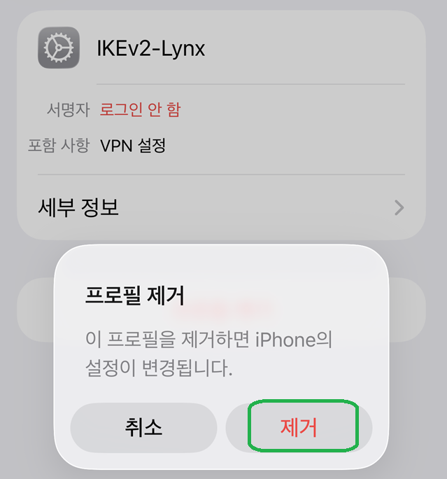 "¼³Á¤" -> "ÀϹÝ" -> "VPN ¹× ±â±â °ü¸®" ¸¦ ¿°í »èÁ¦ ÇÁ·ÎÆÄÀÏ("IKEv2-Lynx") ¸¦ ¼±Åà ÈÄ¿¡ "ÇÁ·ÎÇÊ Á¦°Å"